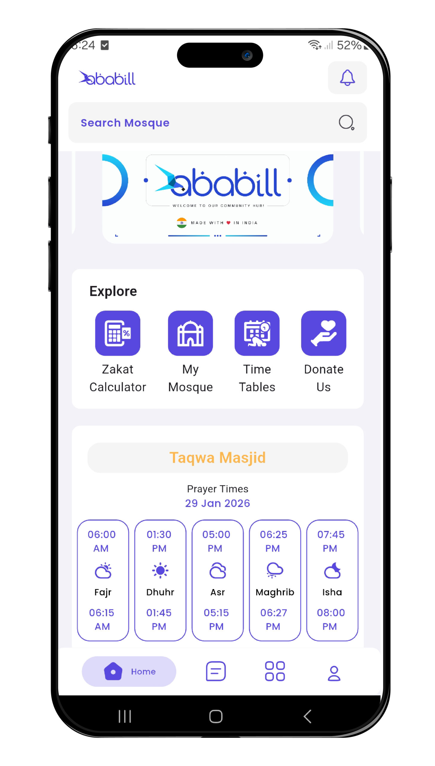 Stay connected with your Masjid through prayer updates, real-time announcements, Zakat calculations, and meaningful community support.