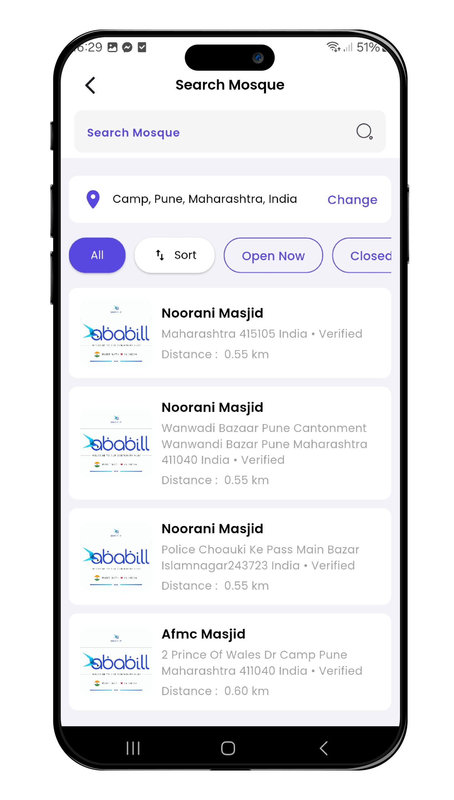 After downloading and registering on Ababill, use the search feature to find your Masjid by name or location. Once you find it, simply tap “Join” to connect. You may need approval from the Masjid admin depending on their settings.